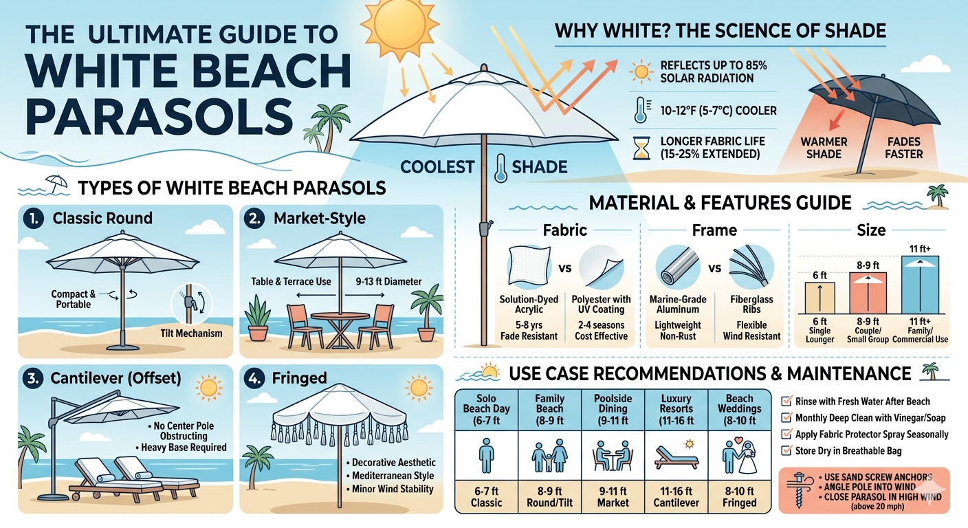 Arten von weißen Strandsonnenschirmen: Welcher Stil passt zu Ihren Bedürfnissen?